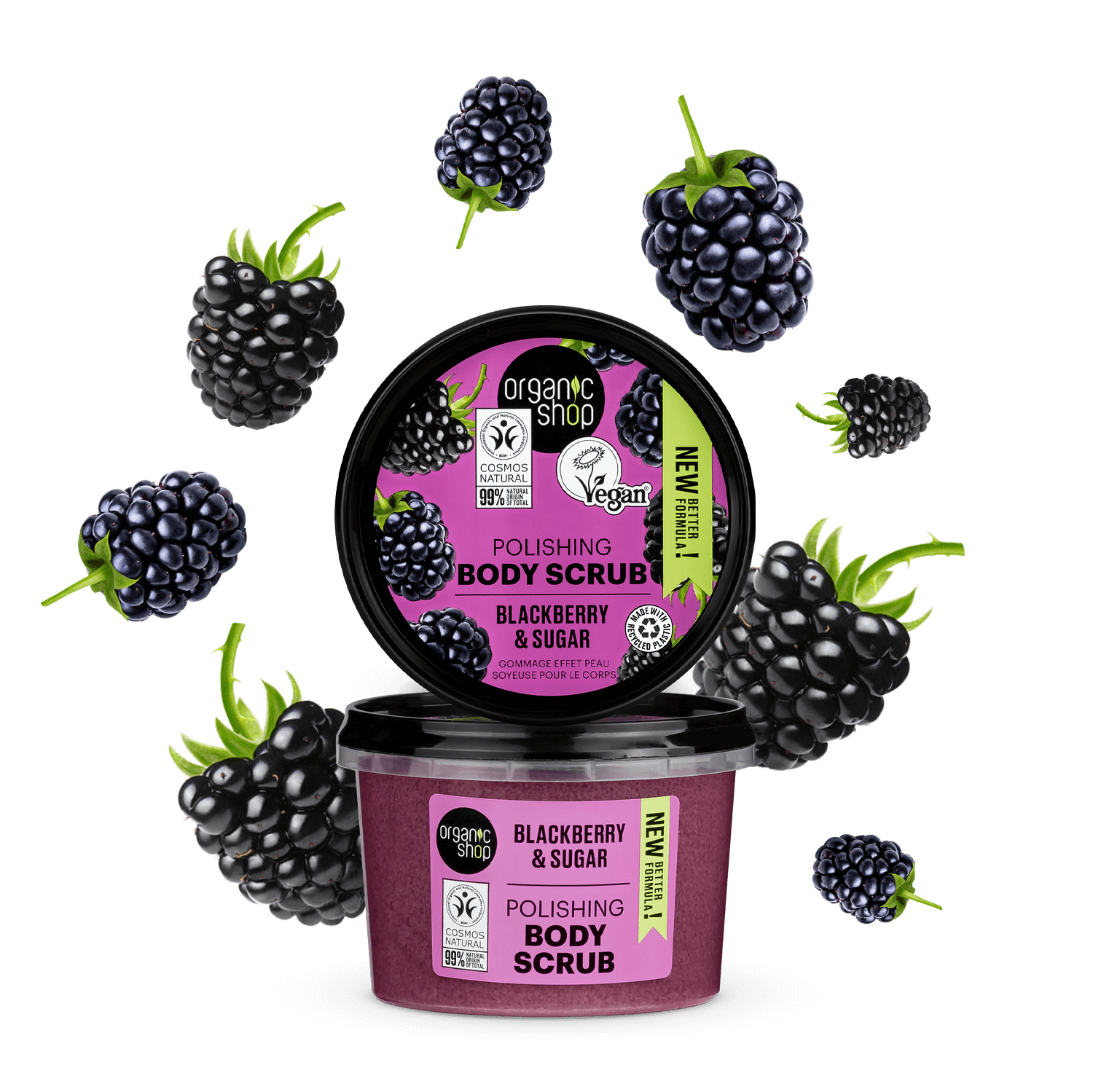 Berrylicious skin magic! Organic blackberry extract nourishes & softens, sugar exfoliates. Silky, juicy, full-of-life skin.