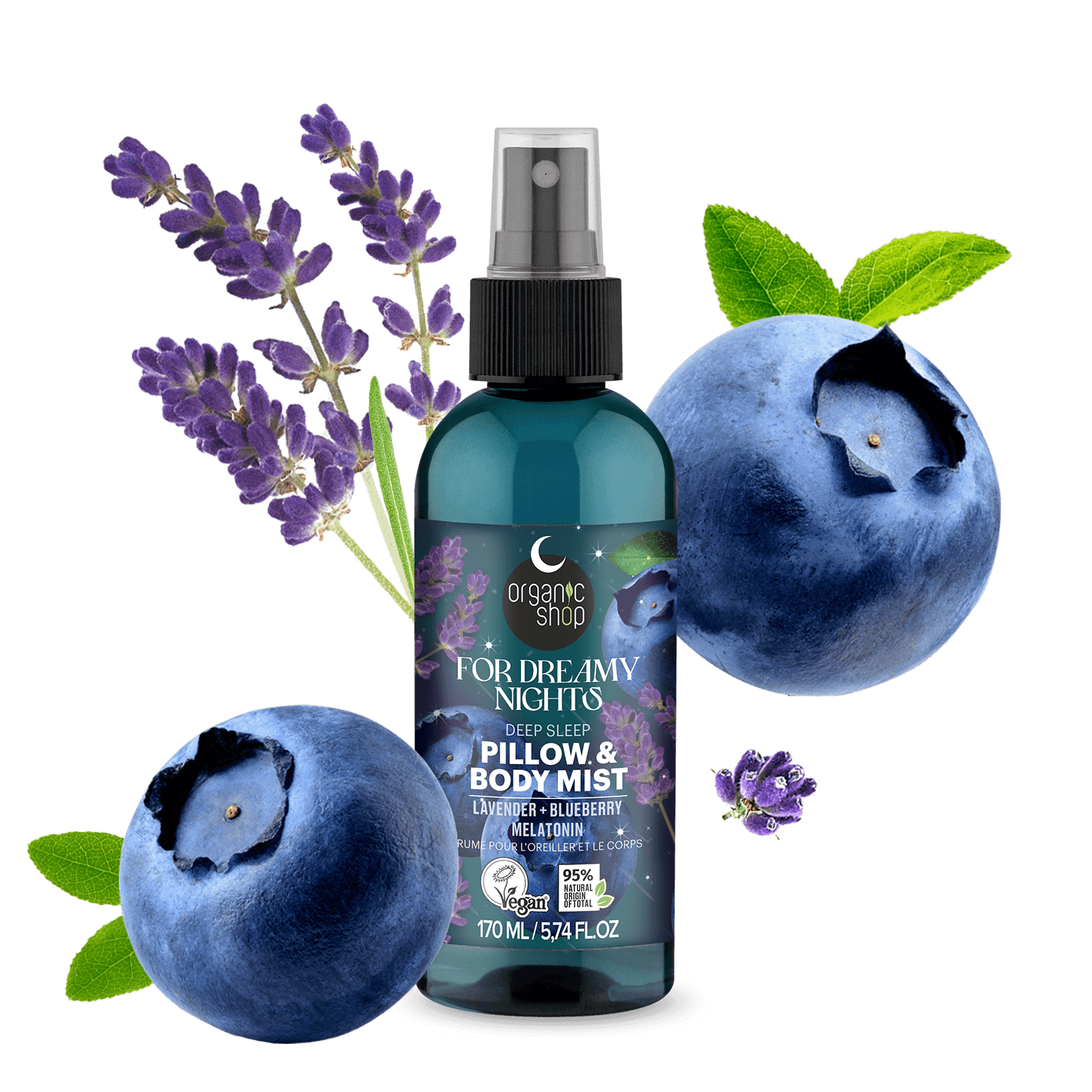 Spray, snuggle, snooze! Lavender + blueberries + melatonin = your new bedtime BFF. Sweet dreams, guaranteed.